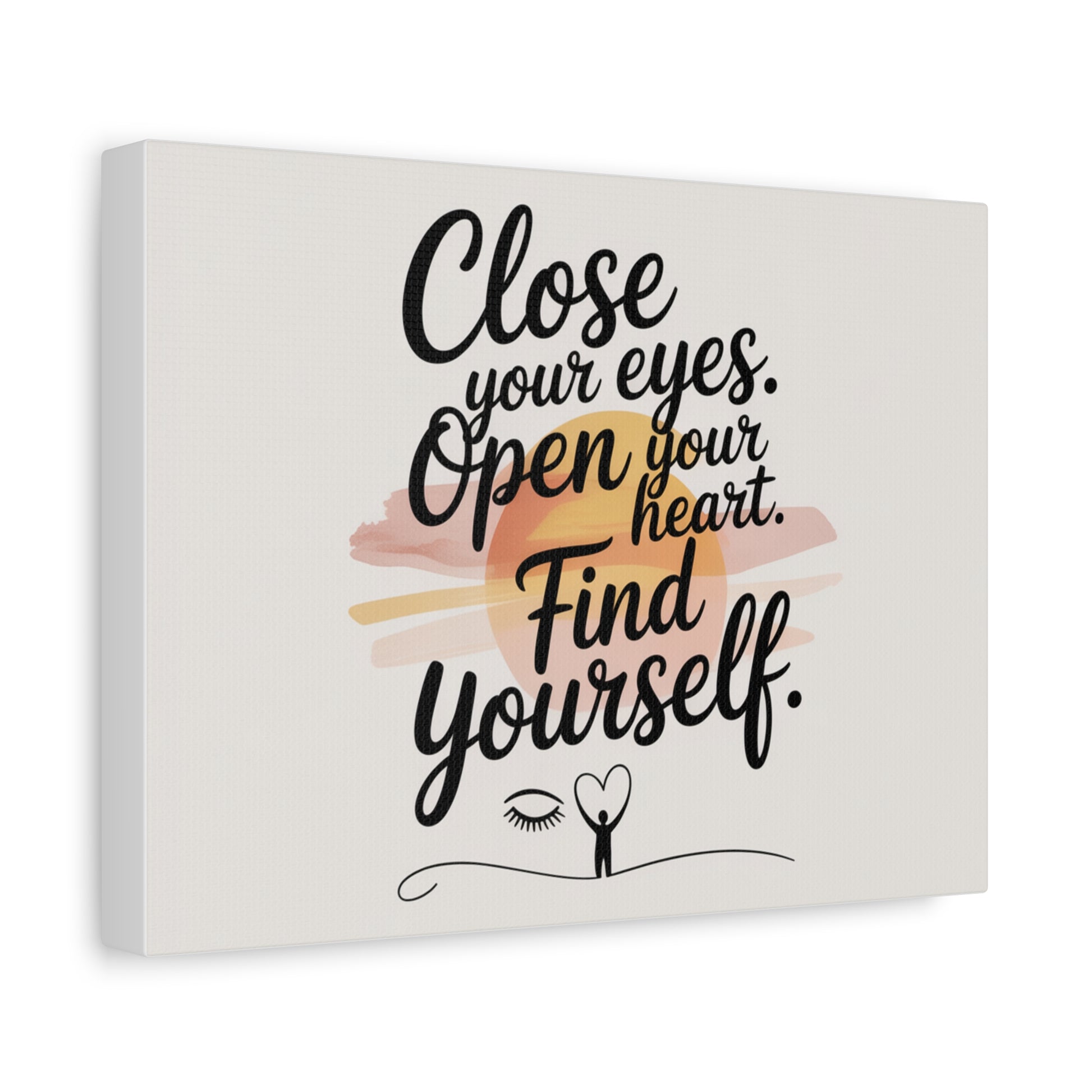 Elevate your space with this stunning Matte Canvas print that encourages introspection with its soothing message: "Close your eyes. Open your heart. Find yourself." This inspirational piece adds warmth and tranquility to any room, perfect for those seeking motivation and positivity in their surroundings. Ideal for home decor enthusiasts, this canvas serves as a wonderful reminder for self-care and mindfulness. It fits beautifully in living rooms, bedrooms, or offices, making it a great gift for friends and family. Perfect for celebrations like home warmings, birthdays, or any occasion that deserves a touch of elegance and inspiration. Celebrate personal growth during the New Year or provide comfort to someone during tough times—this canvas speaks to the heart.